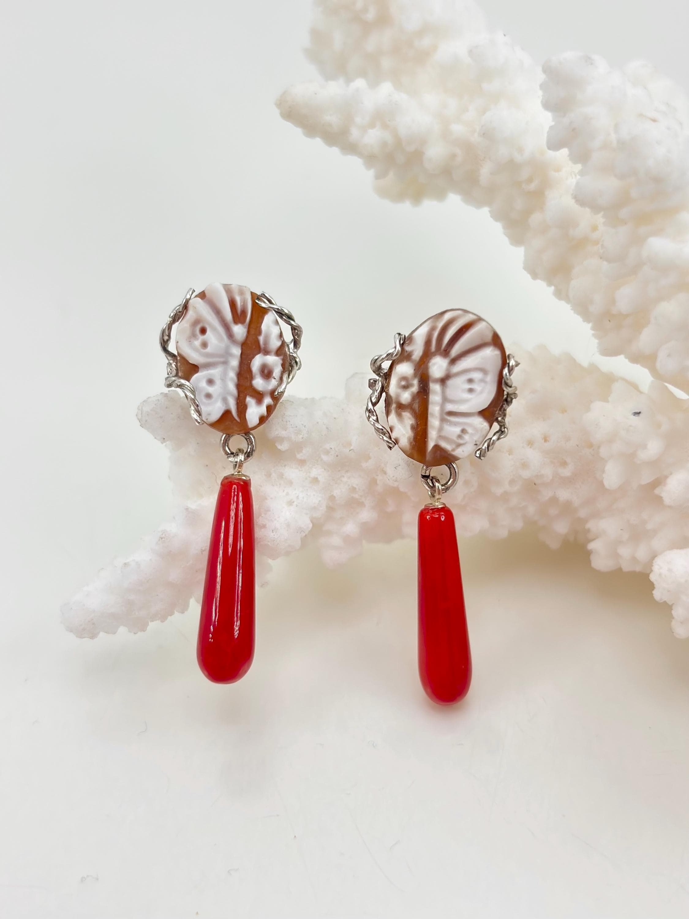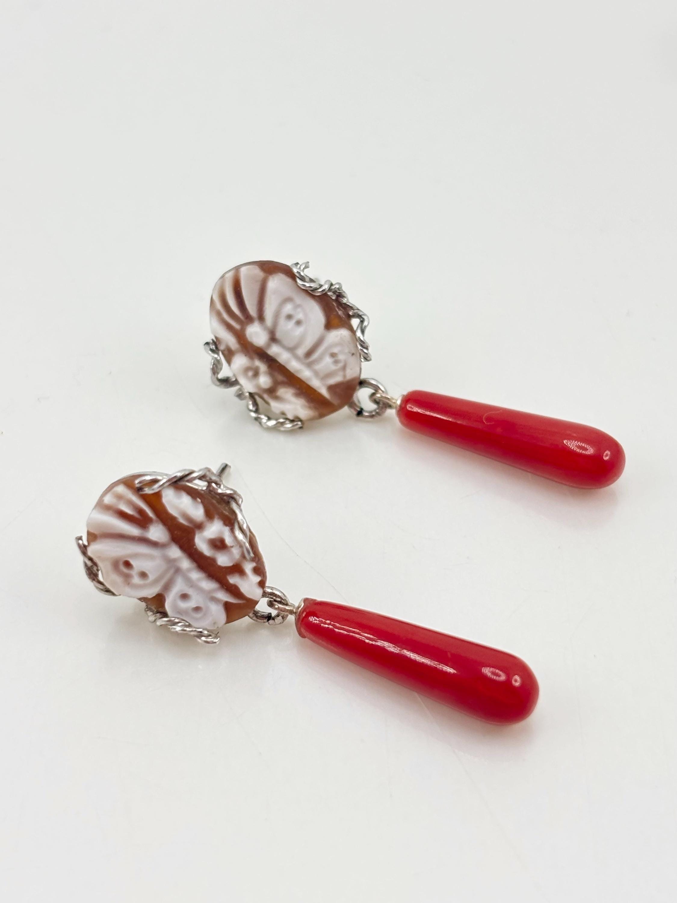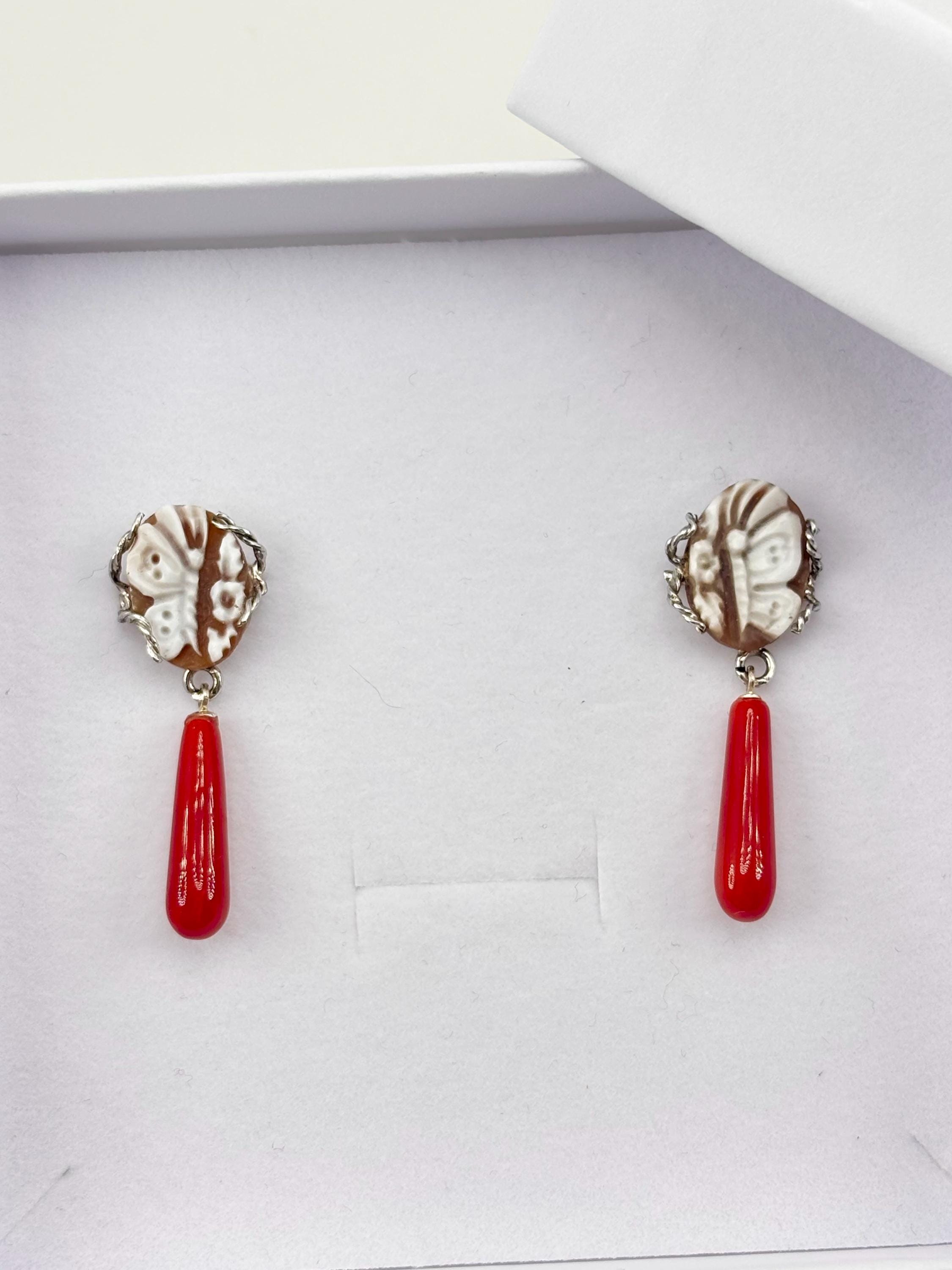 Dangle earrings with a hand-engraved cameo on a Madagascar Cassis shell and natural red coral drops from the Mediterranean Sea. Set in 925 silver. Handcrafted by artisans in Torre del Greco.