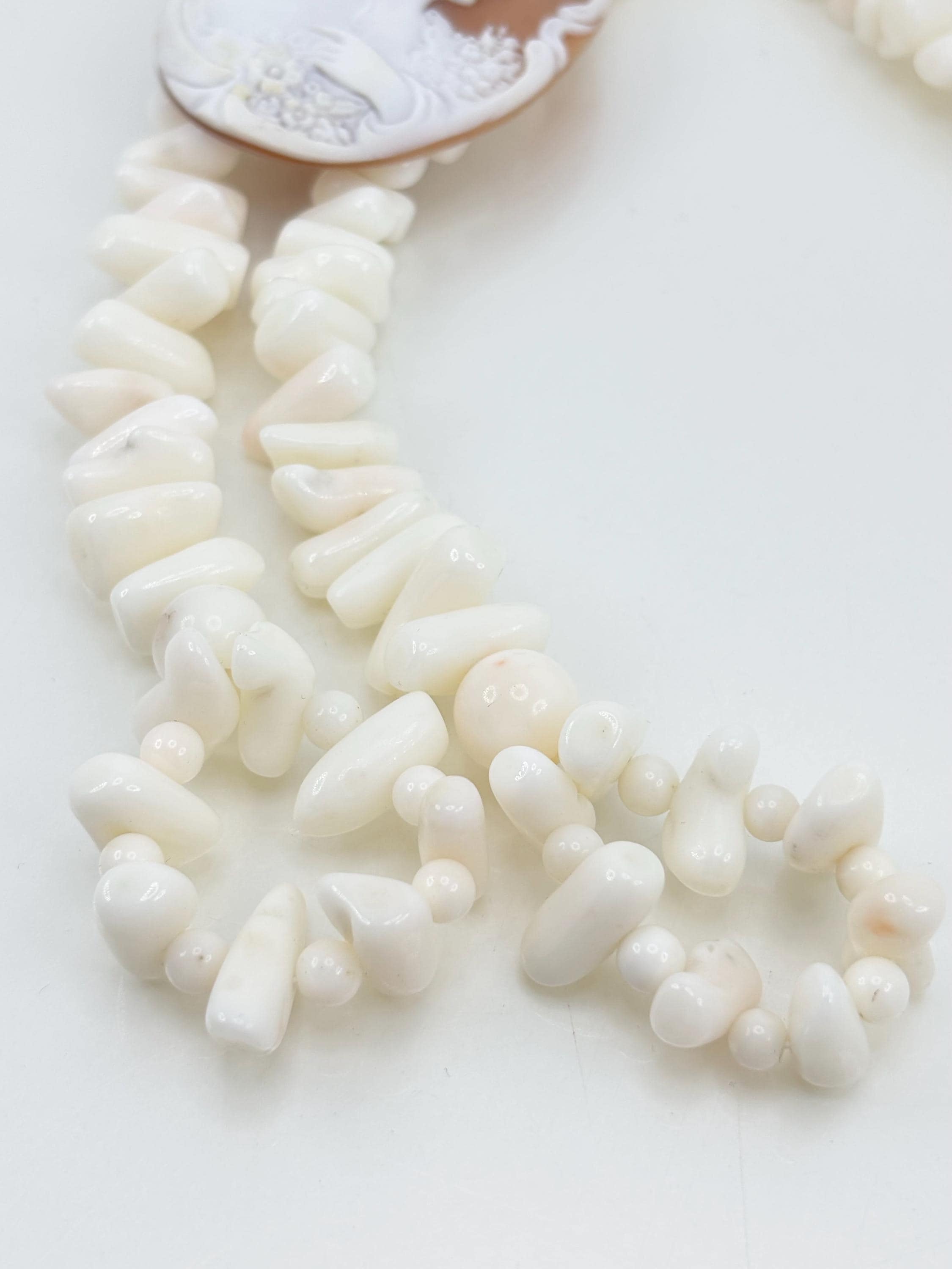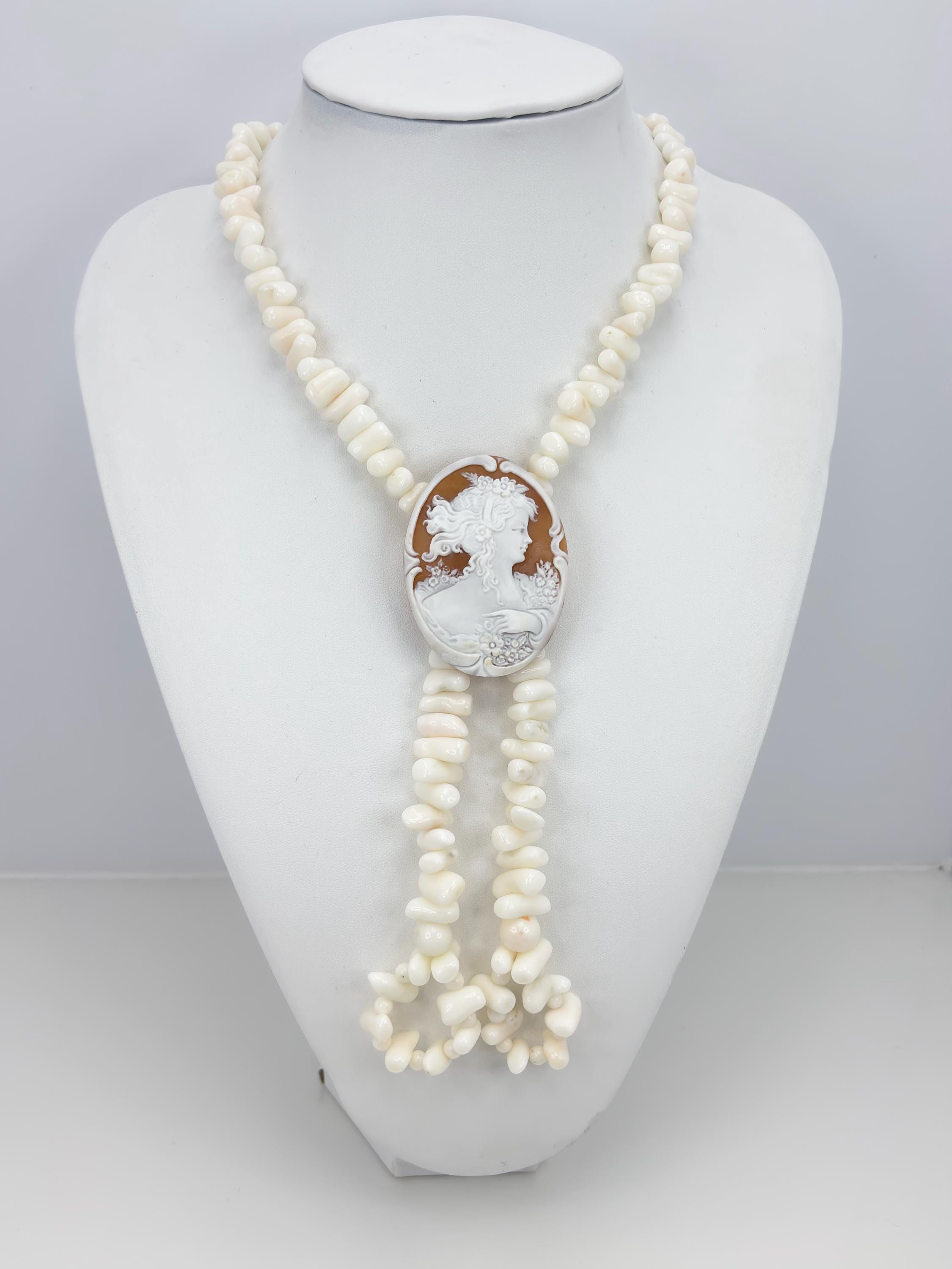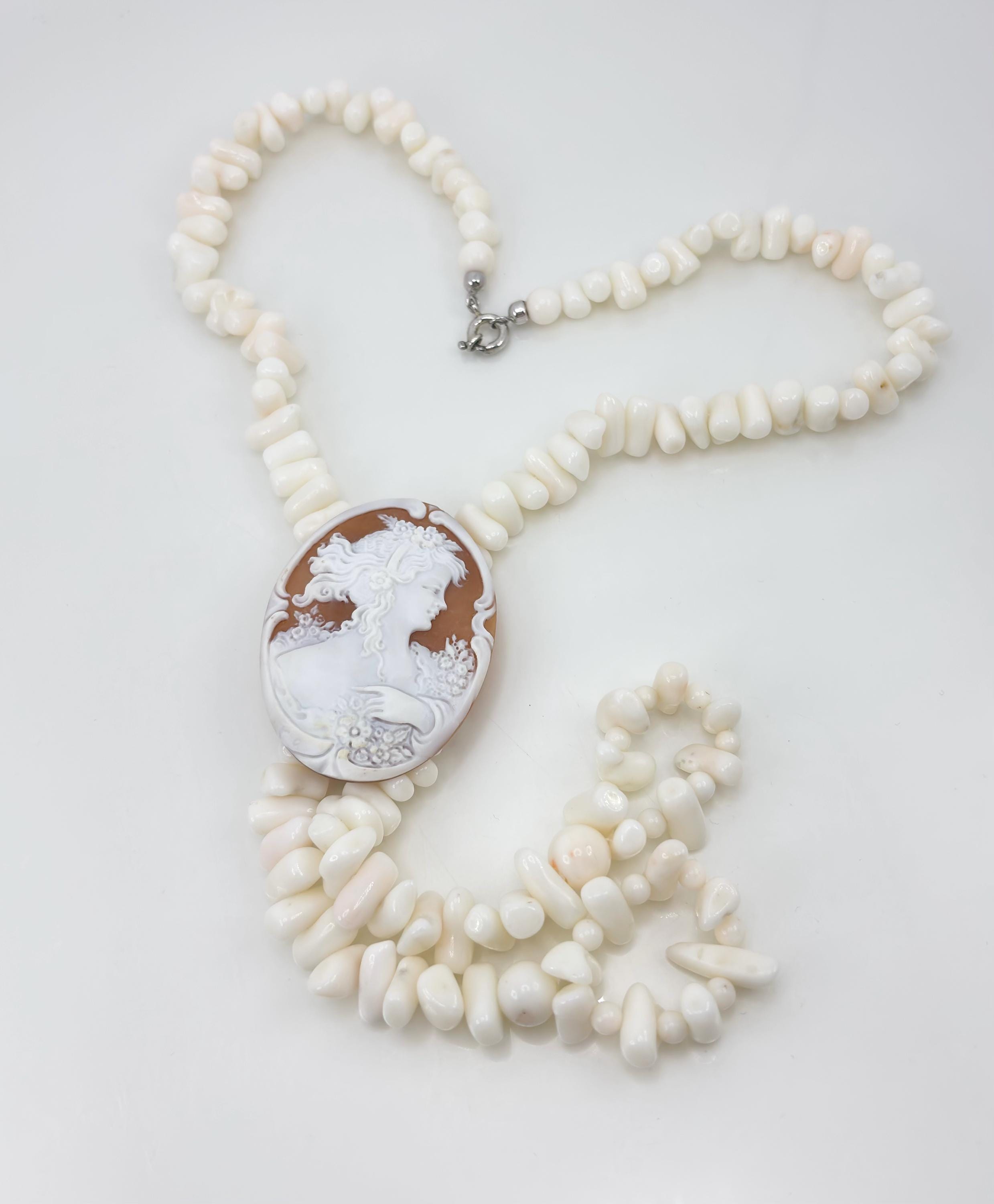 Splendid and unique necklace in pink/white coral from the Pacific Ocean and hand-engraved cameo on a Cassis Madagascariens shell and 925 silver clasp.