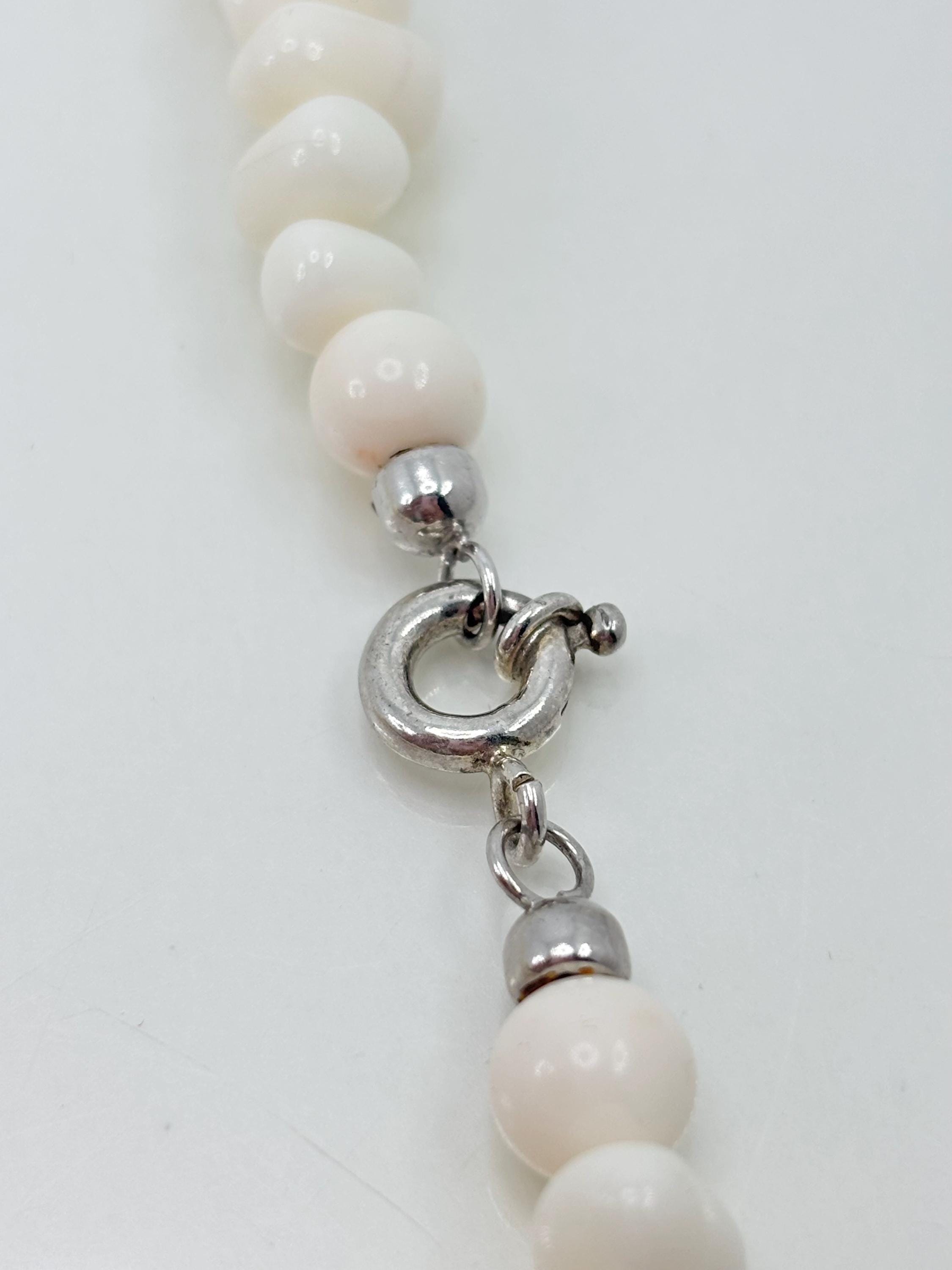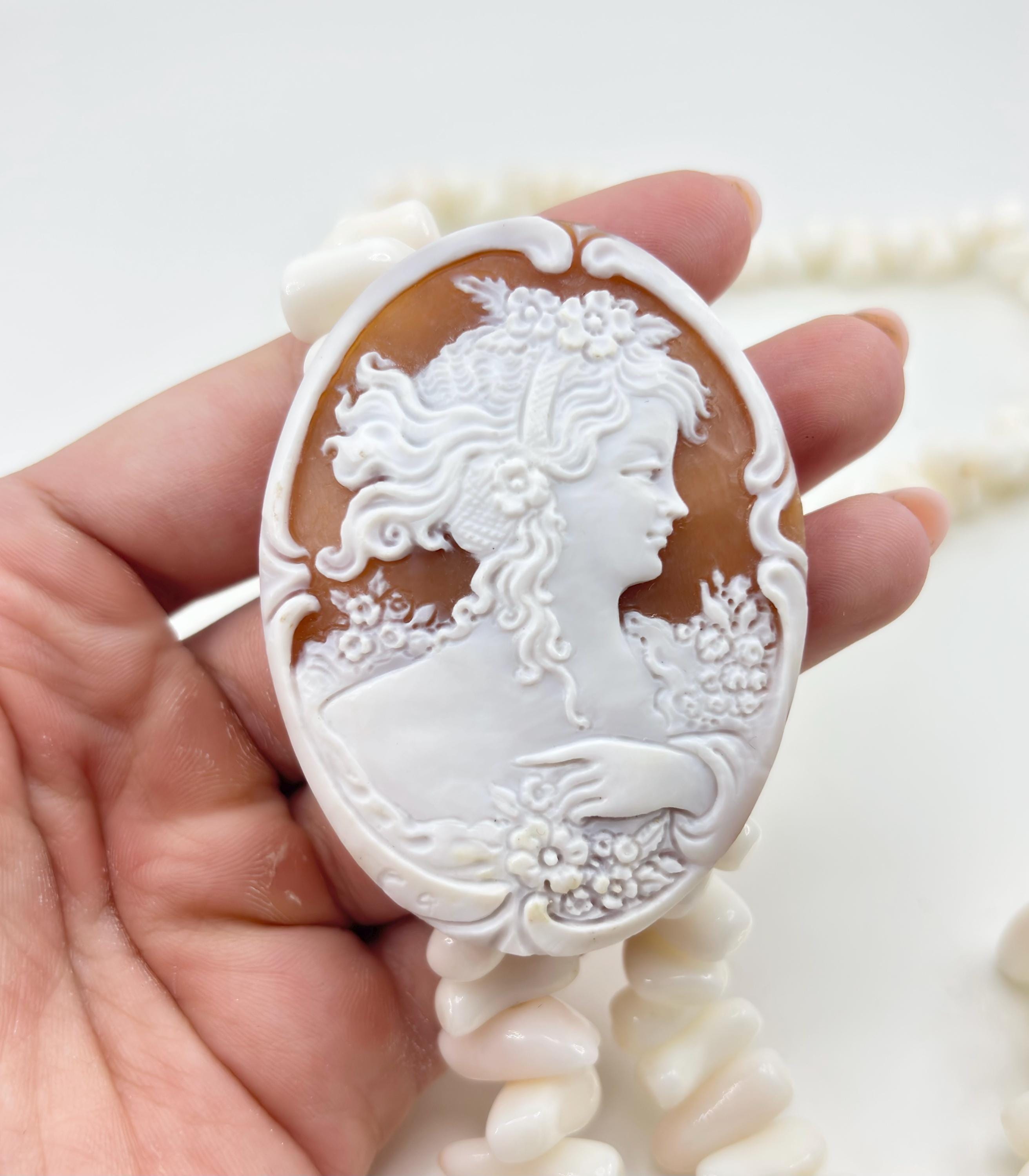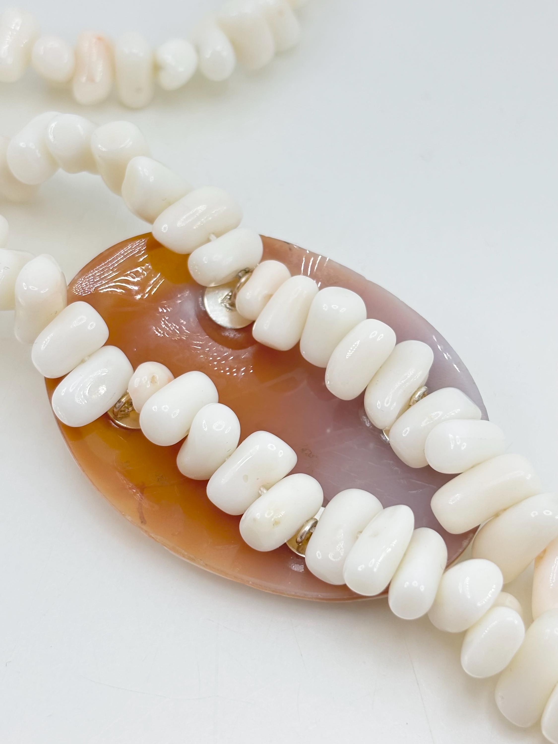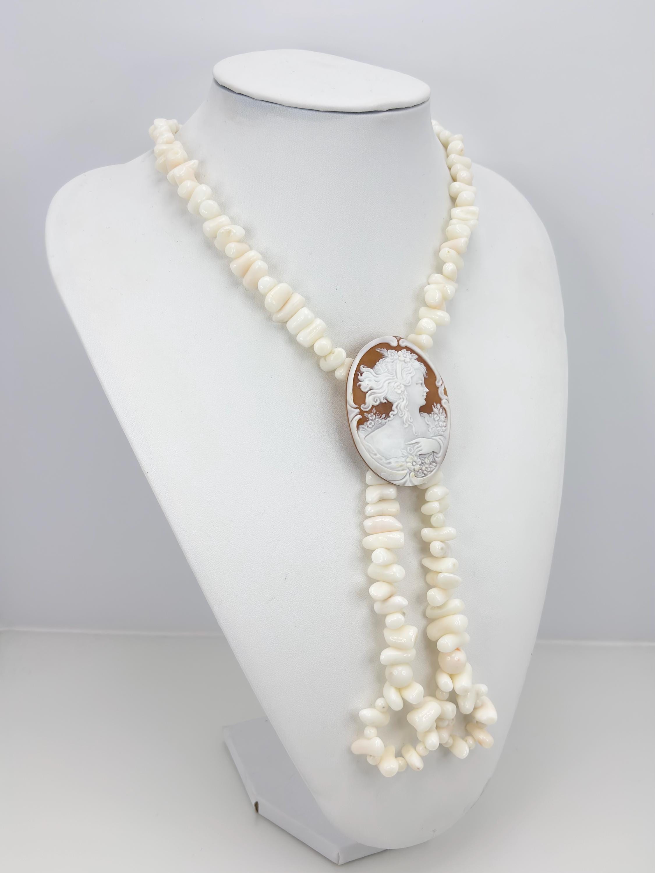 Splendid and unique necklace in pink/white coral from the Pacific Ocean and hand-engraved cameo on a Cassis Madagascariens shell and 925 silver clasp.