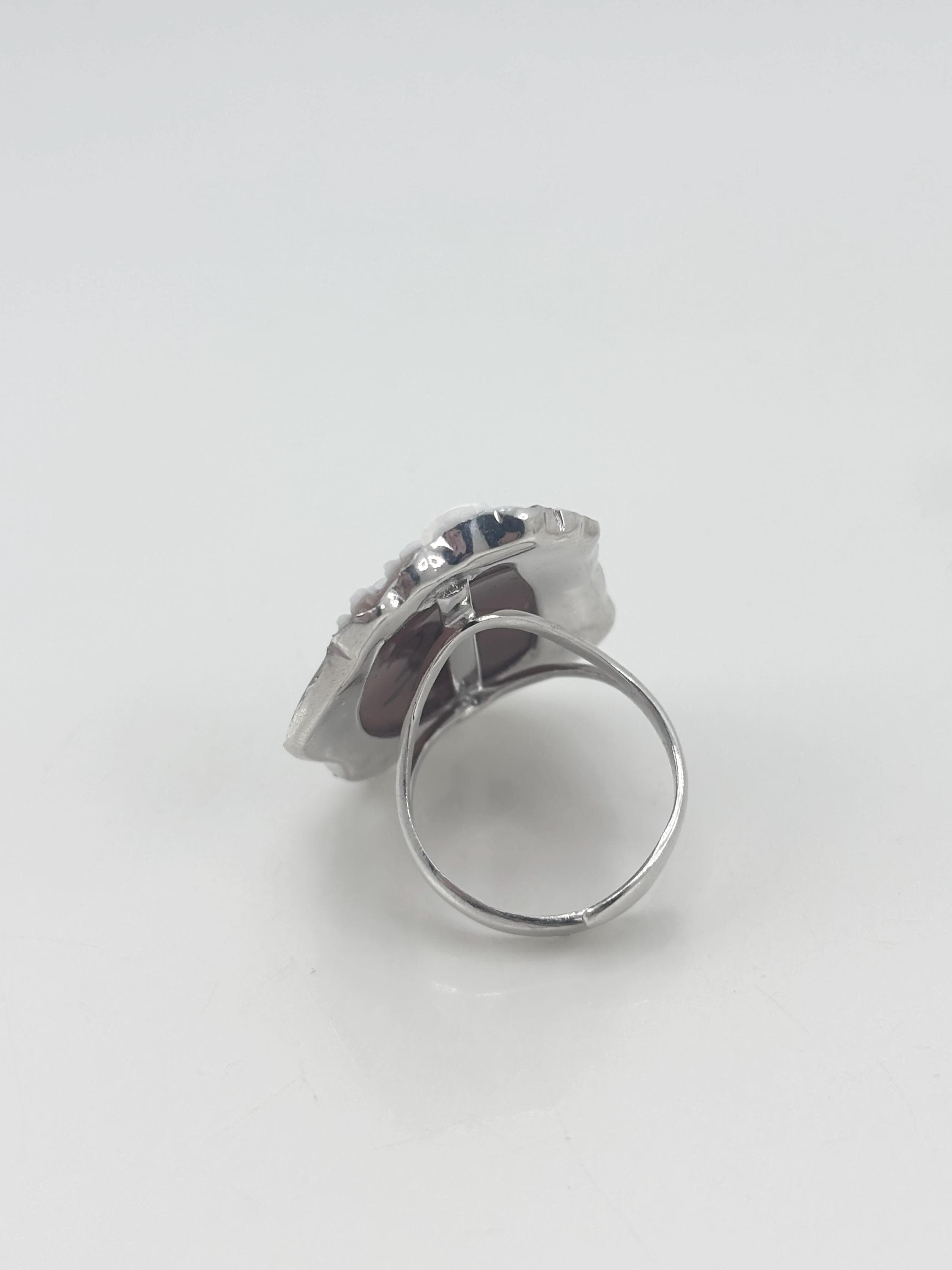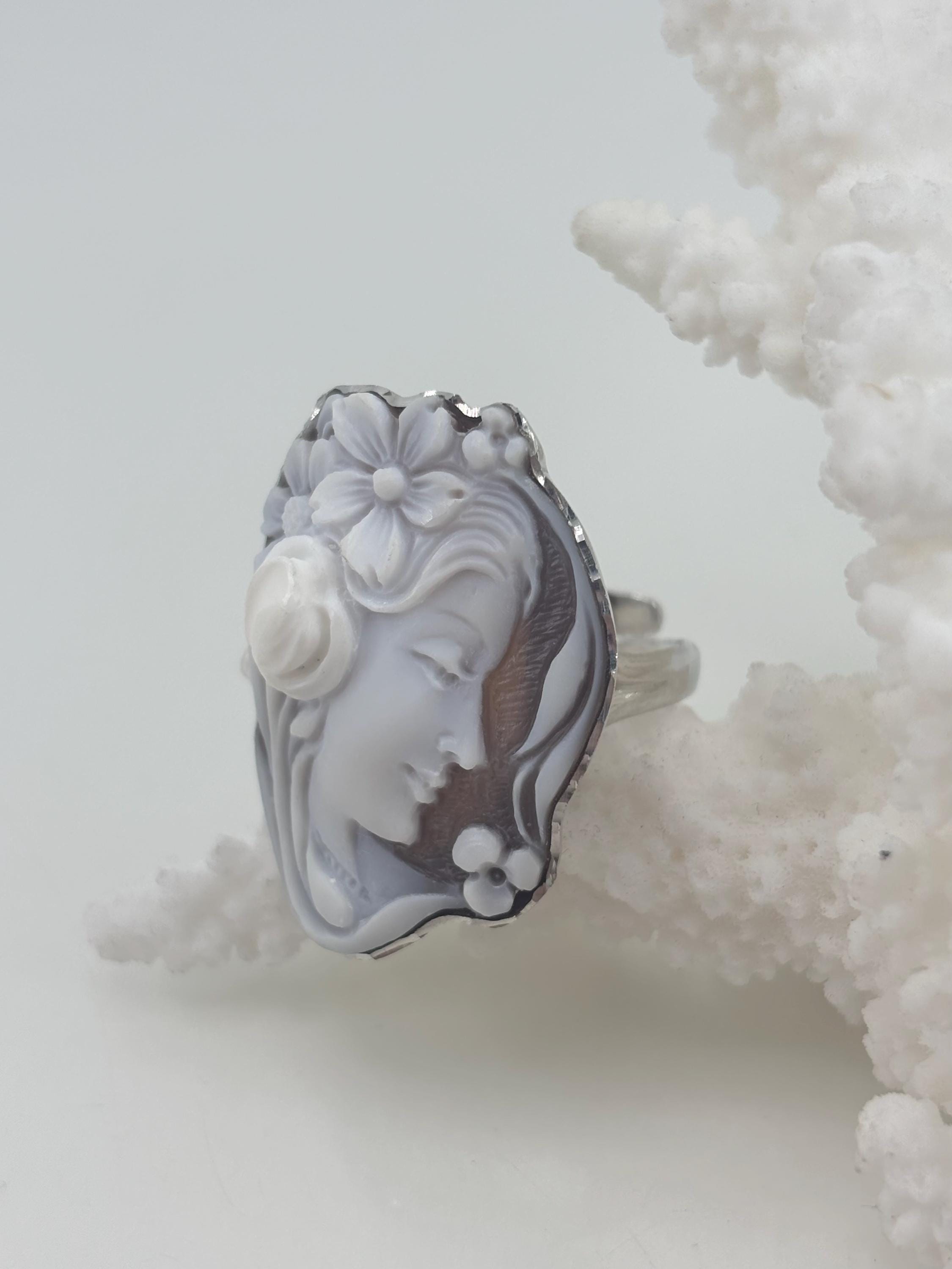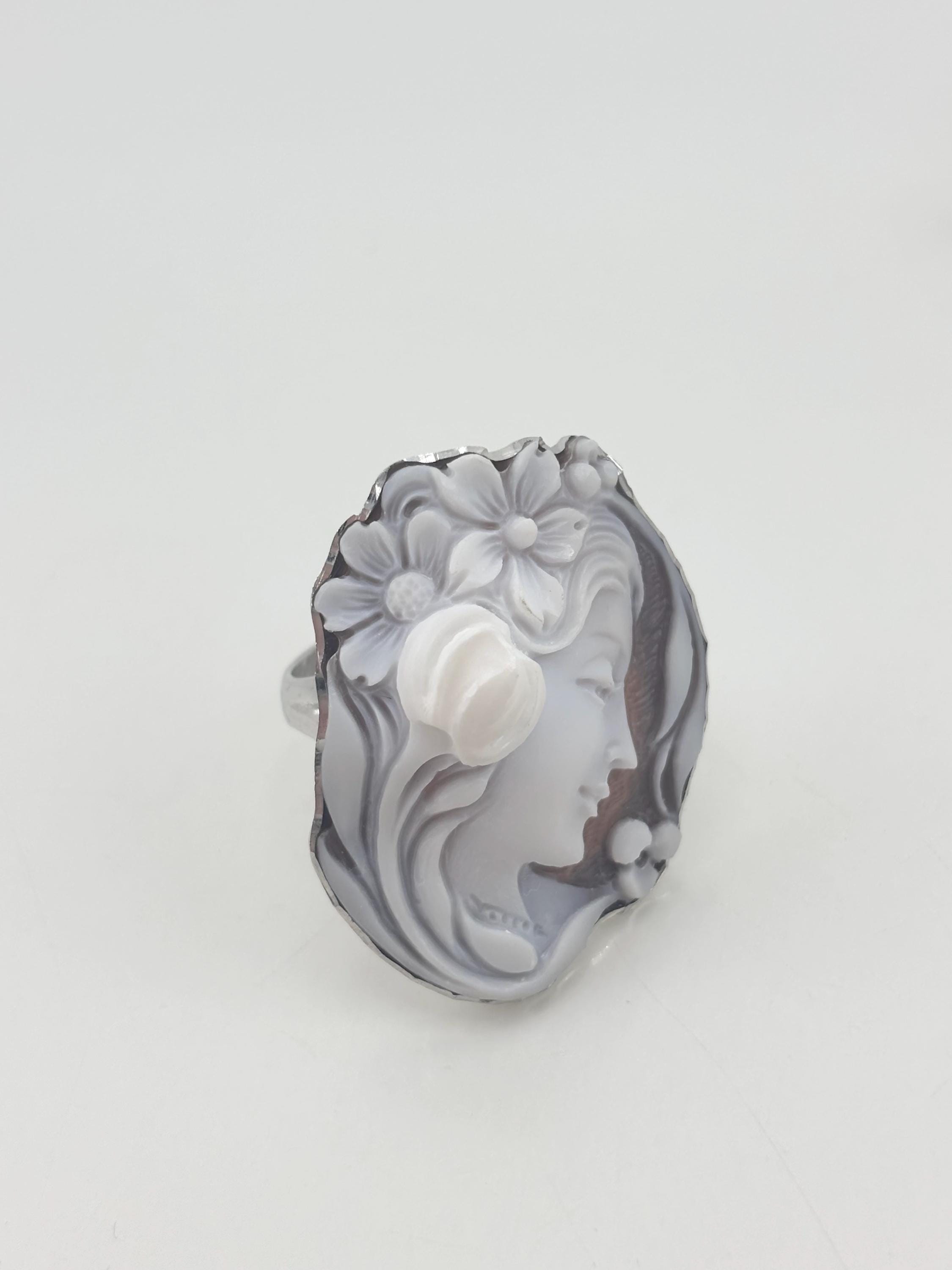 This elegant and eye-catching ring features a hand-engraved cameo on a Madagascan cassis shell, depicting a woman's profile and a floral motif. Set in 925 silver.