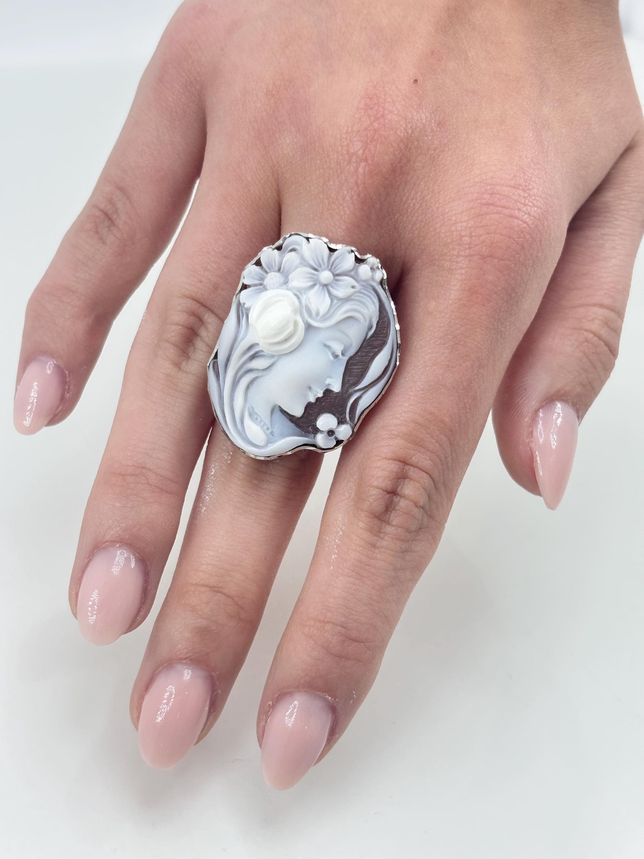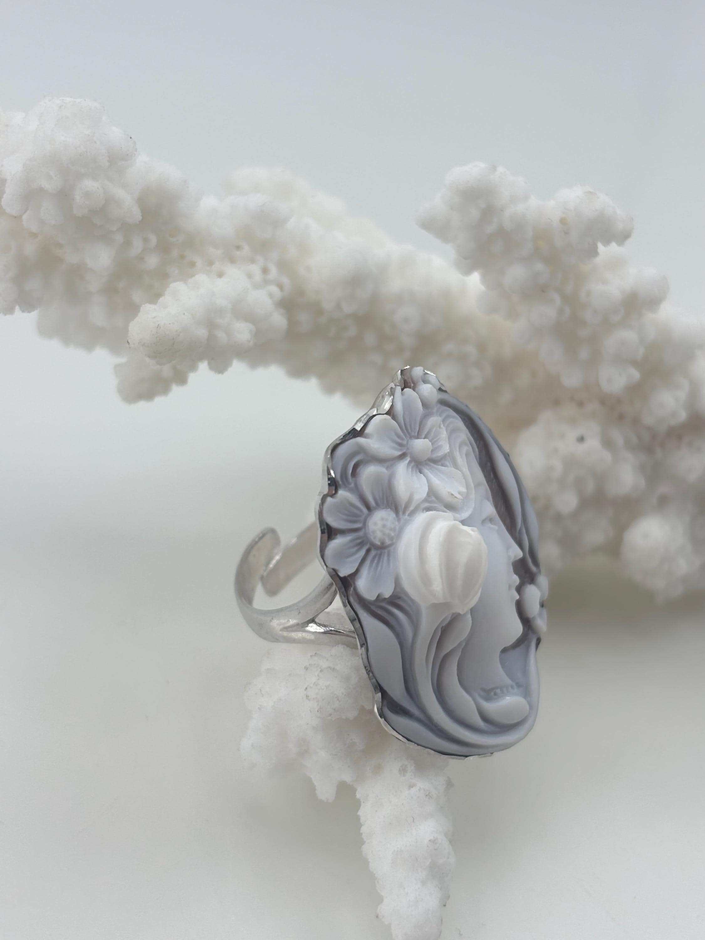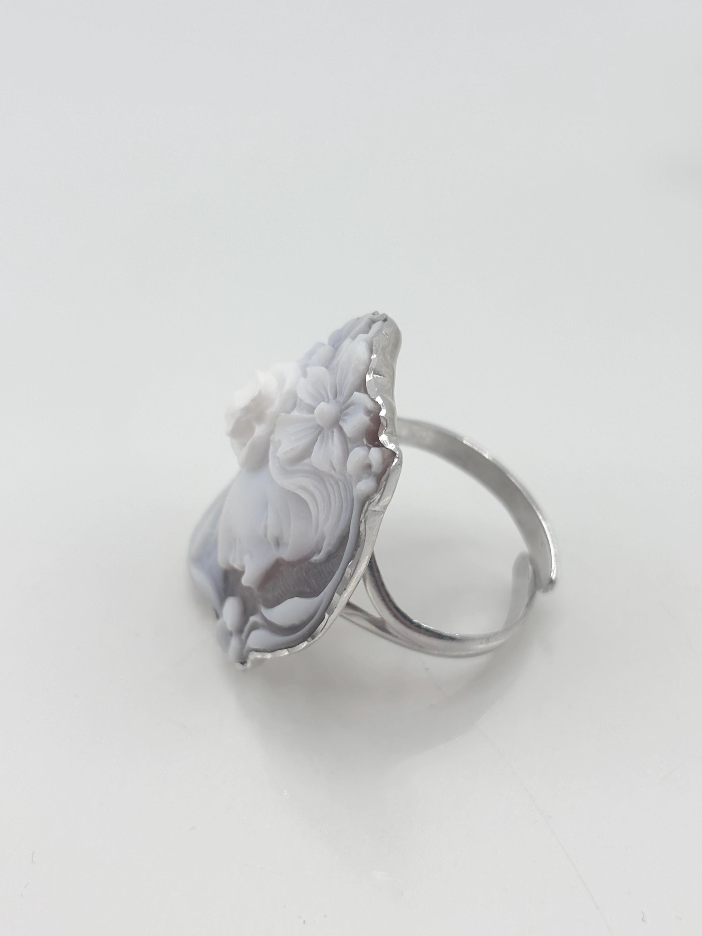 This elegant and eye-catching ring features a hand-engraved cameo on a Madagascan cassis shell, depicting a woman's profile and a floral motif. Set in 925 silver.