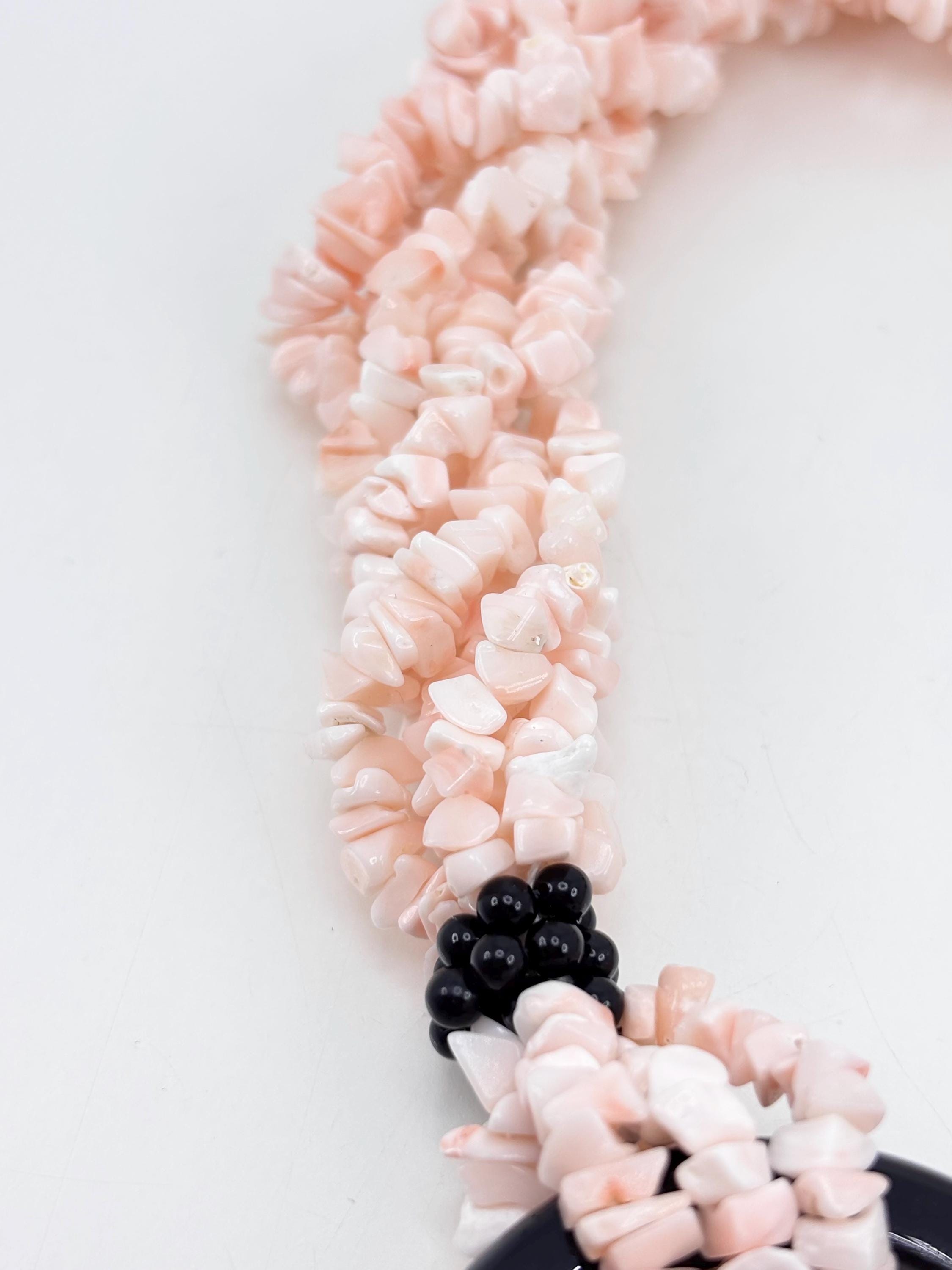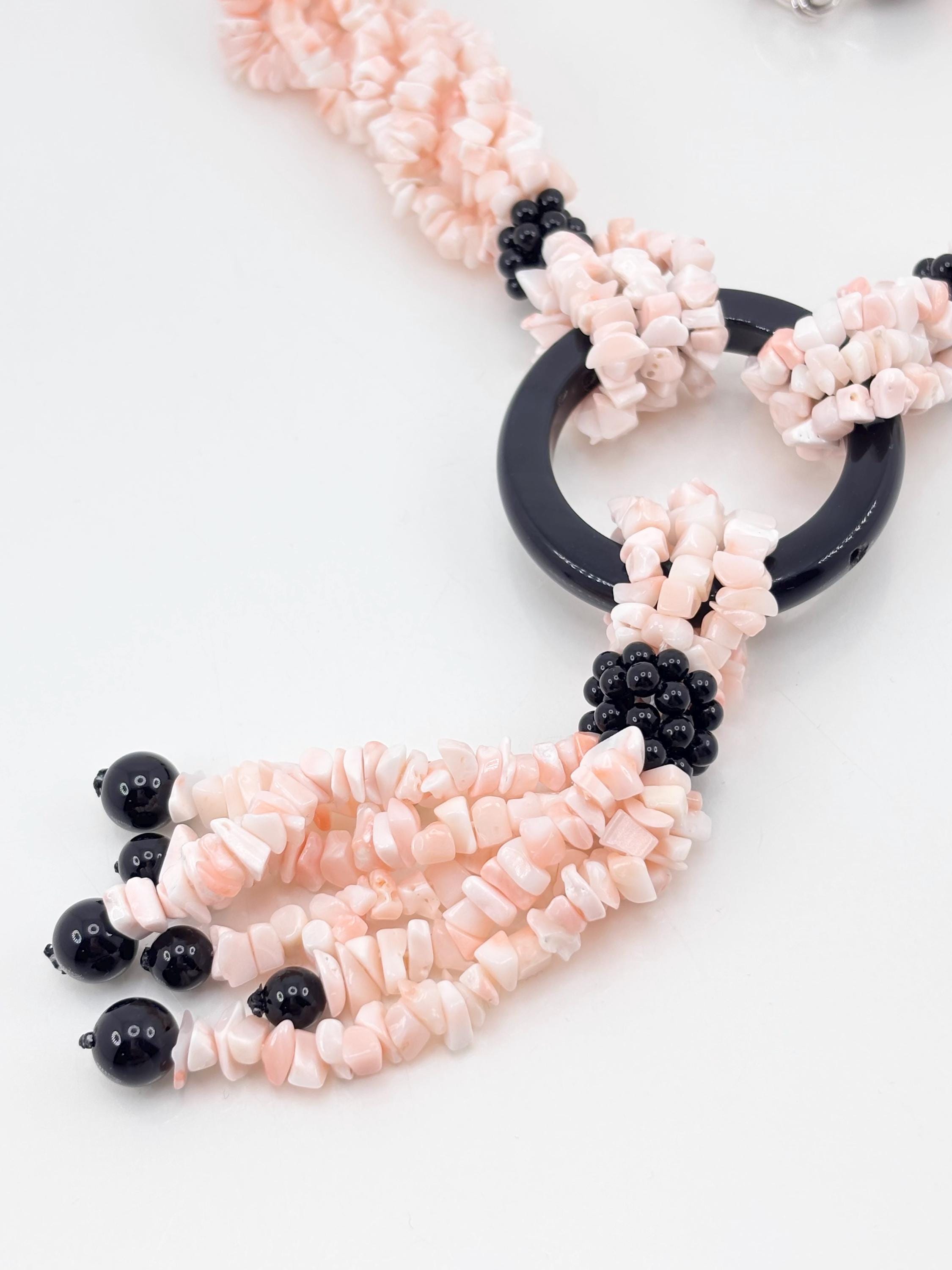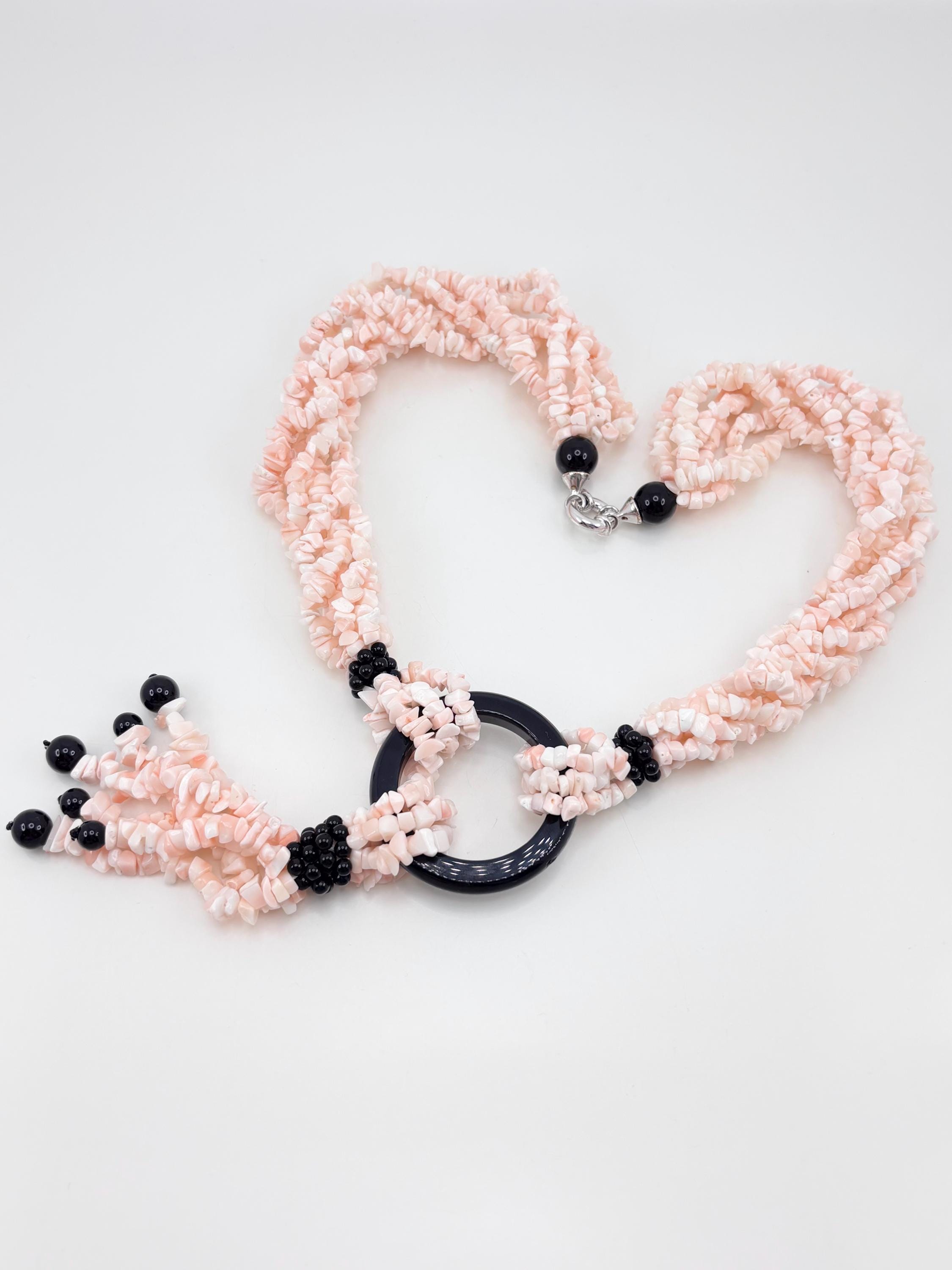 Multi-strand torchon necklace, 6 strands of natural pink coral flakes from the Pacific Ocean and natural black onyx, making the necklace elegant and versatile. 925 silver clasp. Handcrafted by artisans in Torre del Greco.