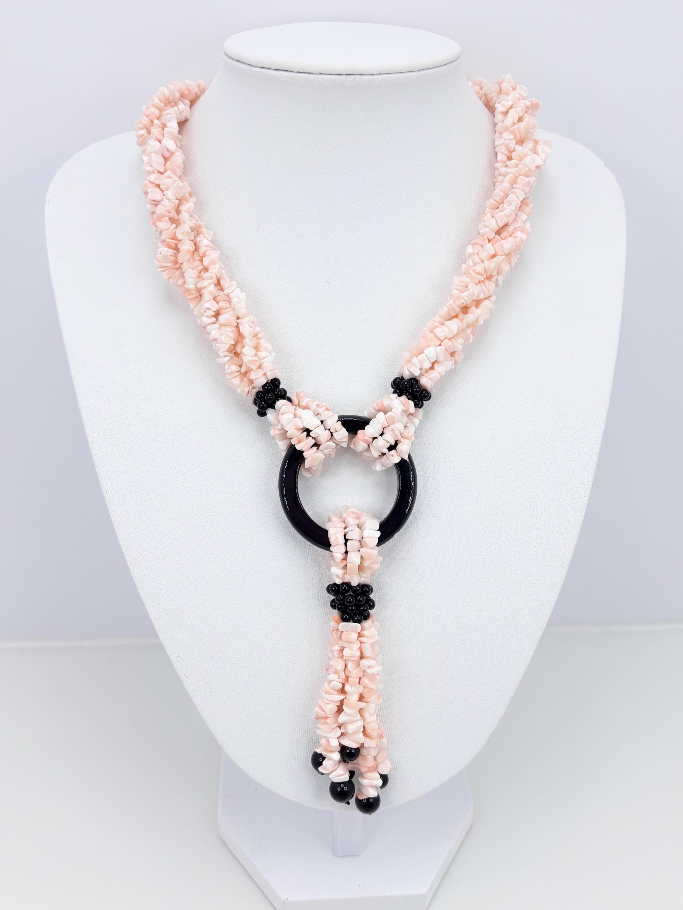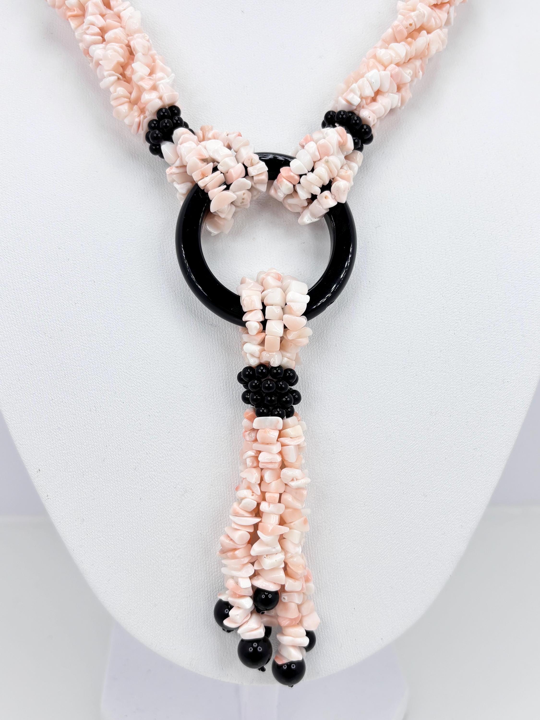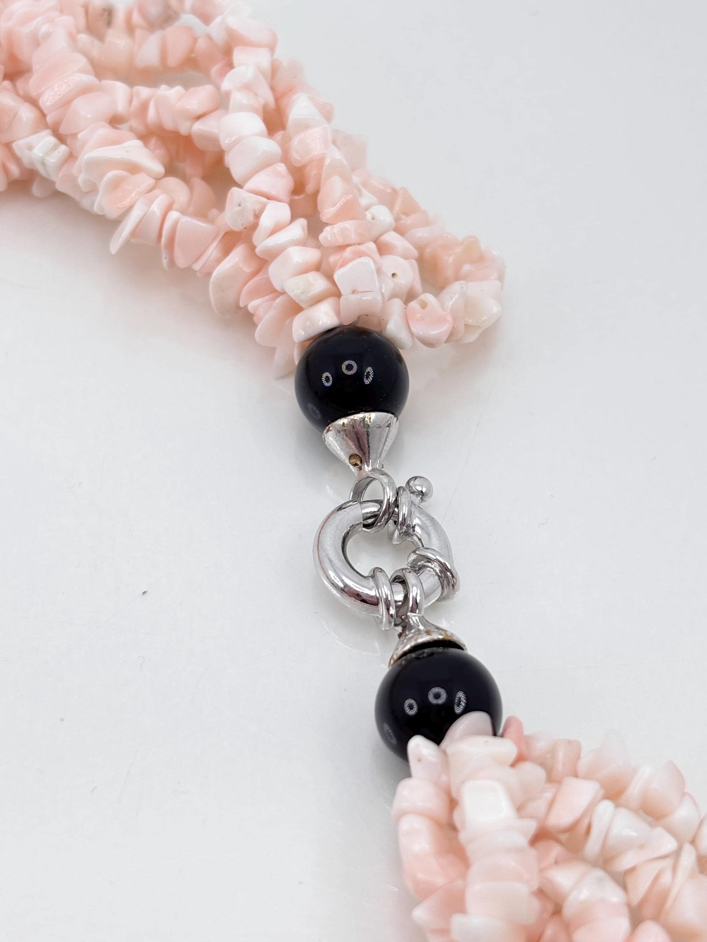 Multi-strand torchon necklace, 6 strands of natural pink coral flakes from the Pacific Ocean and natural black onyx, making the necklace elegant and versatile. 925 silver clasp. Handcrafted by artisans in Torre del Greco.