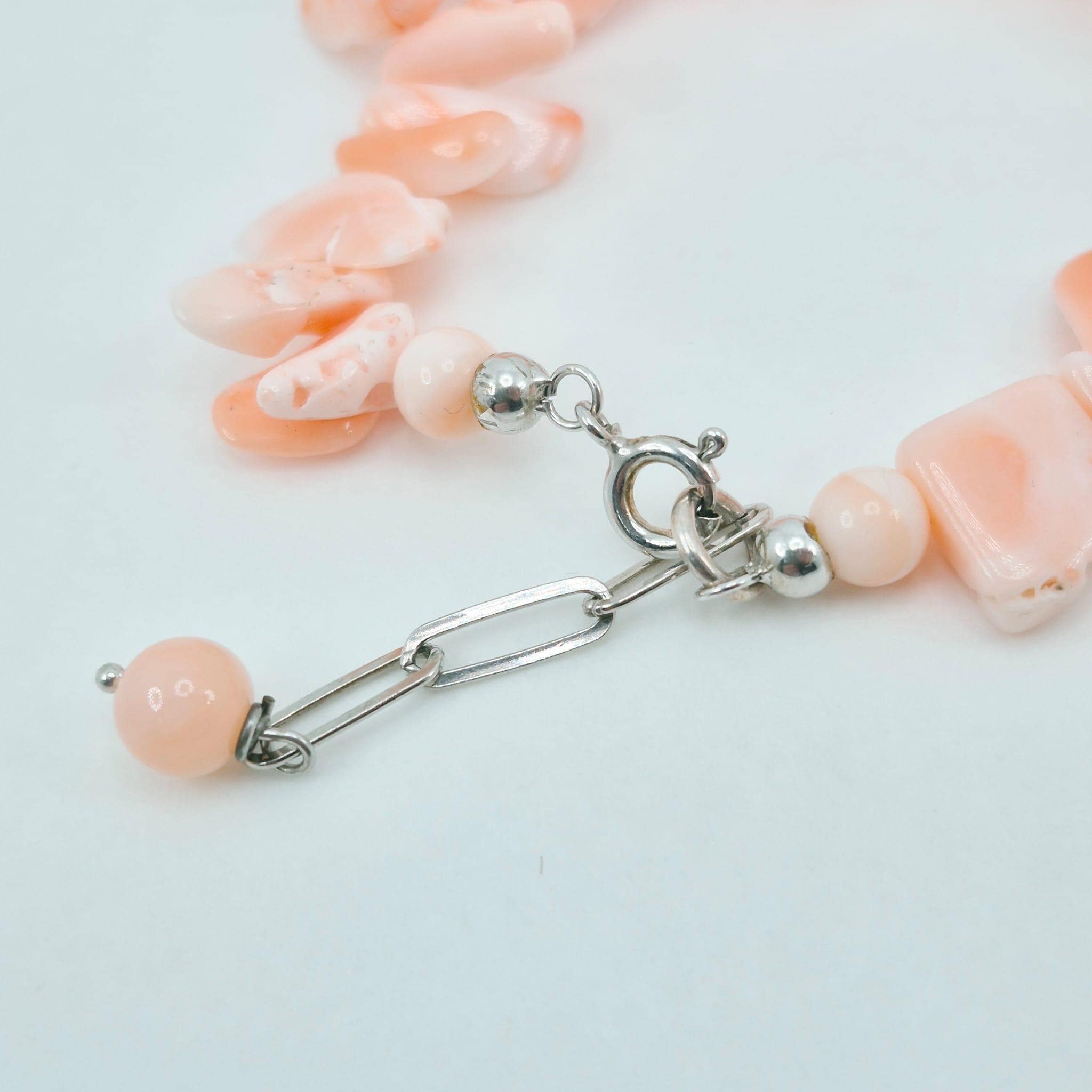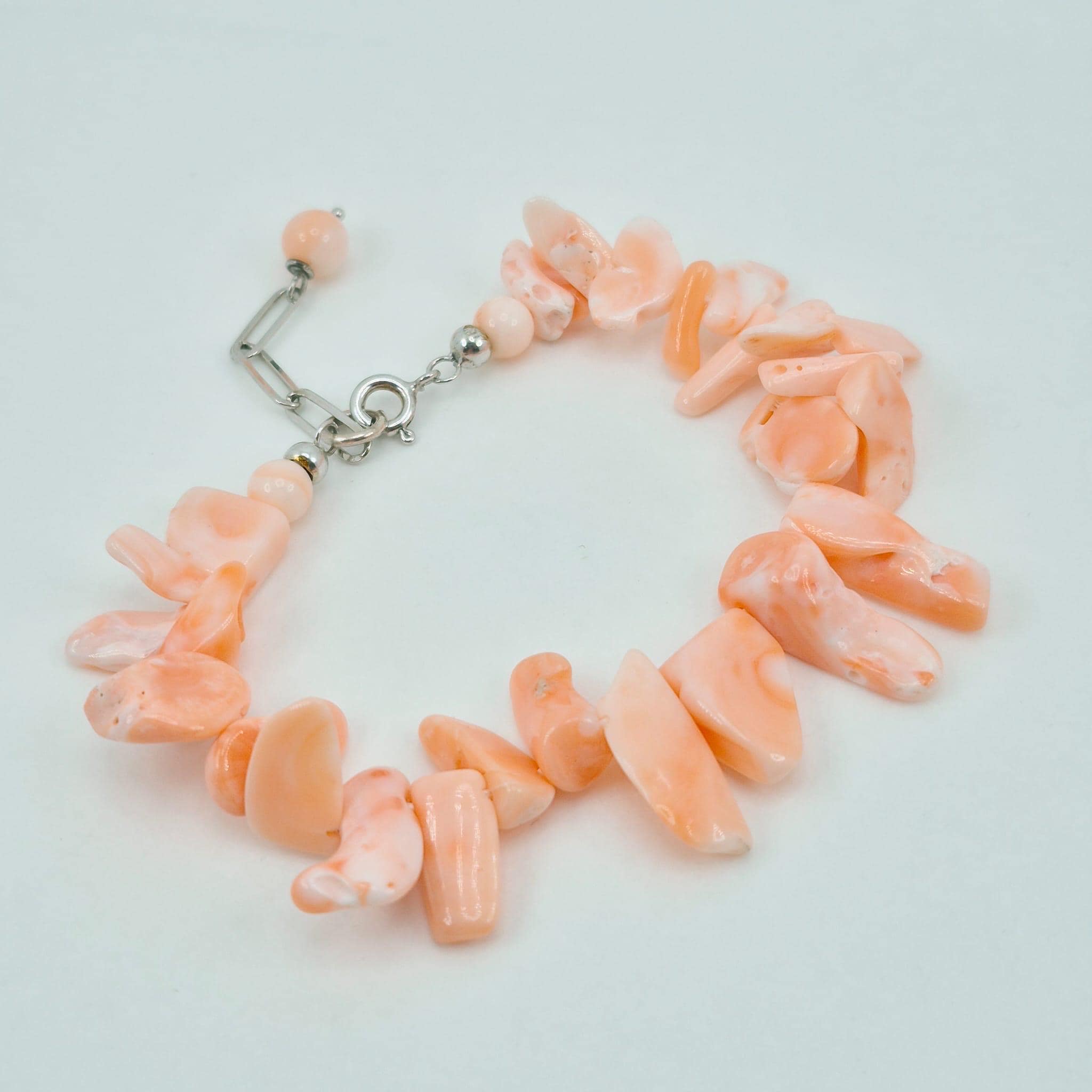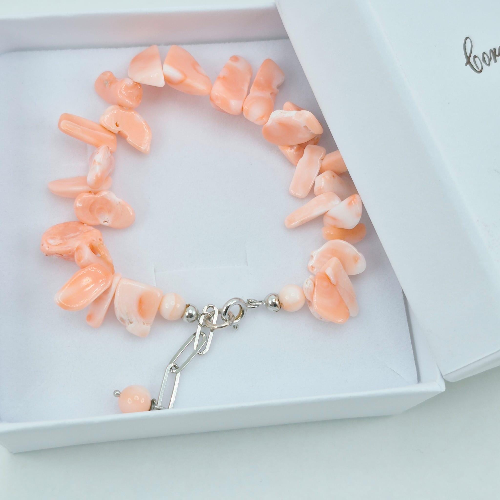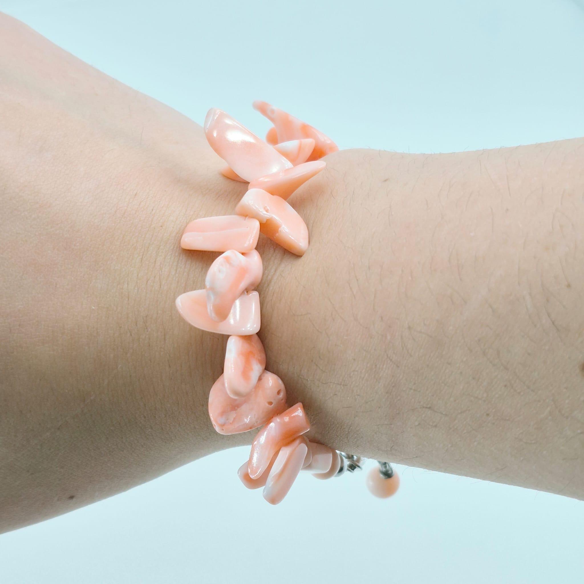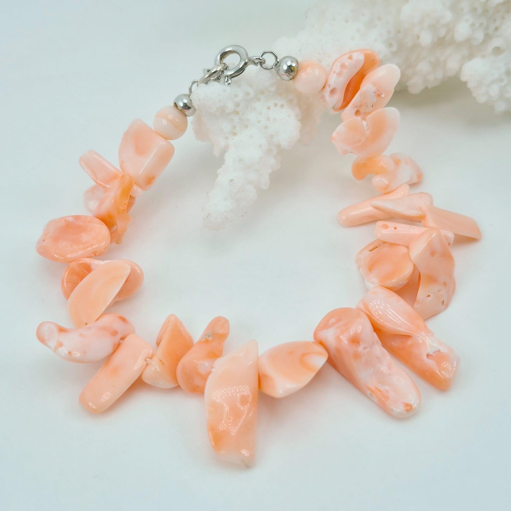 Bracciale in scaglie di corallo rosa naturale proveniente dall’Oceano Pacifico splendida tonalità salmone con chiusura in argento 925.