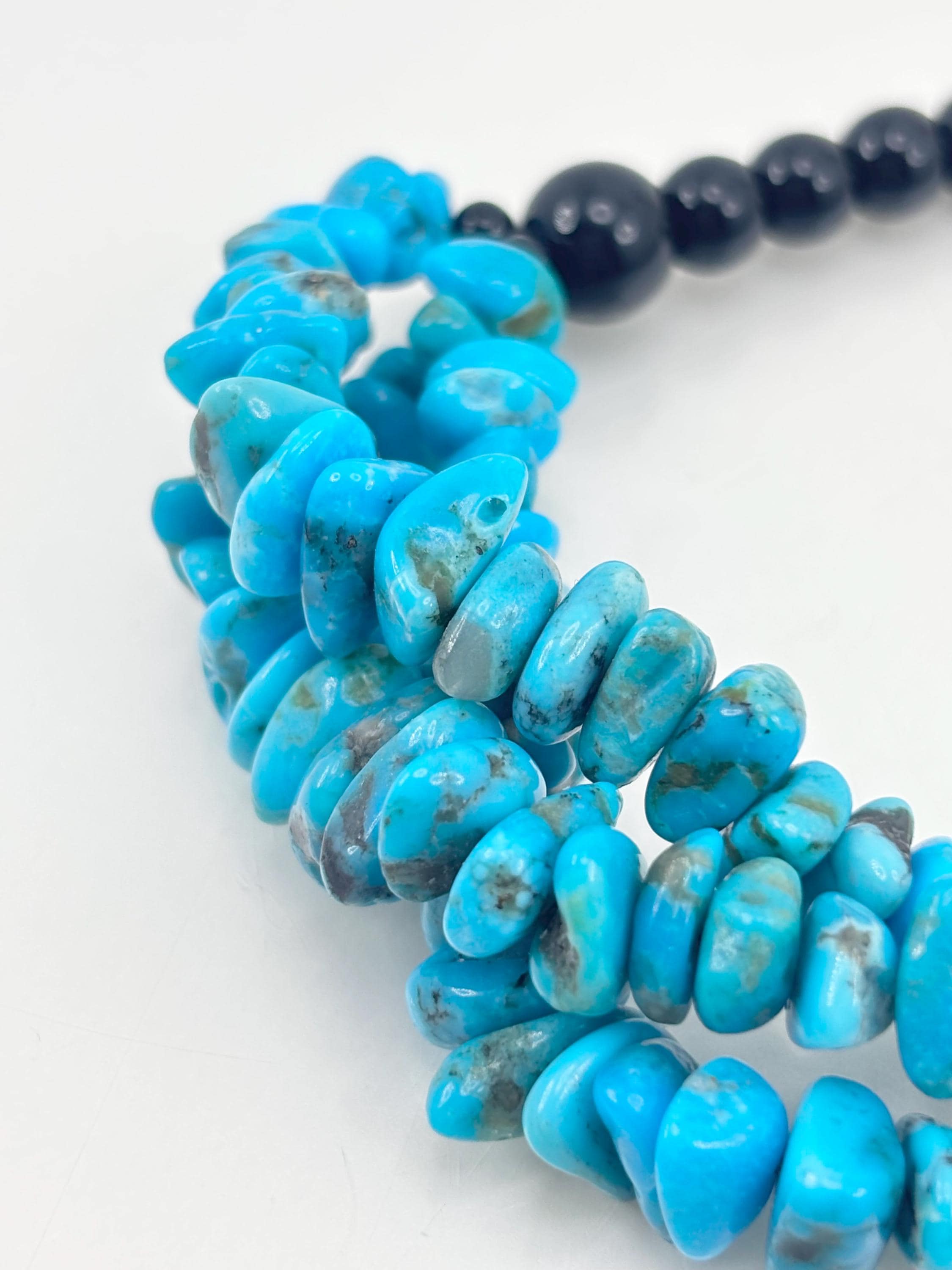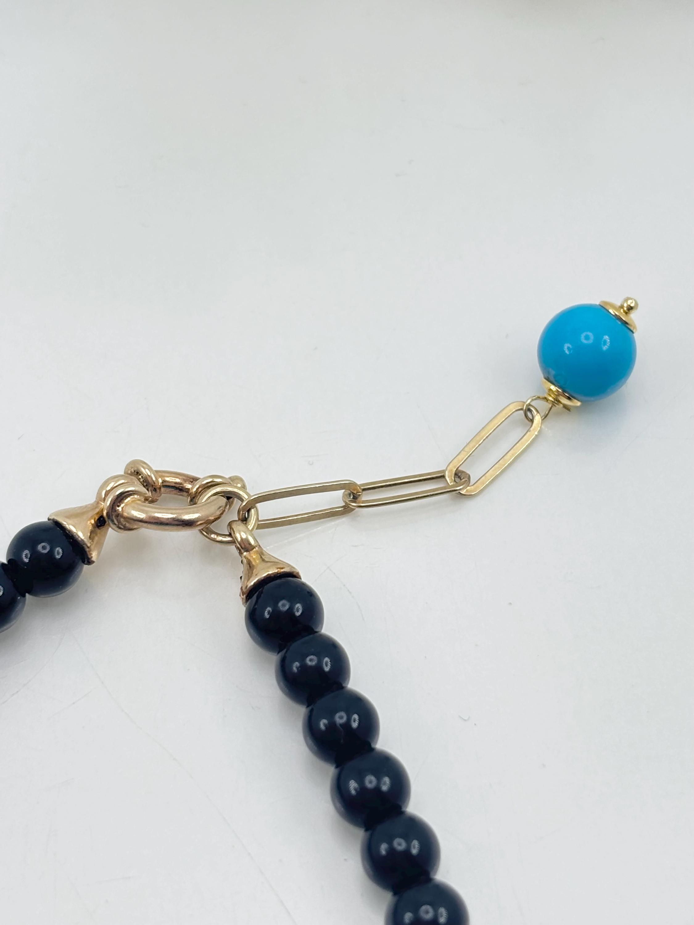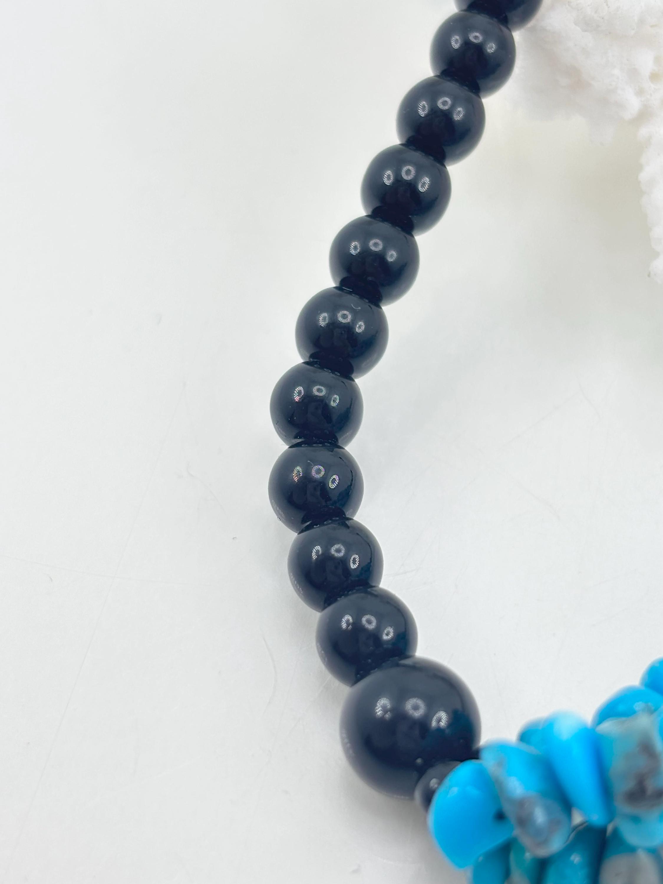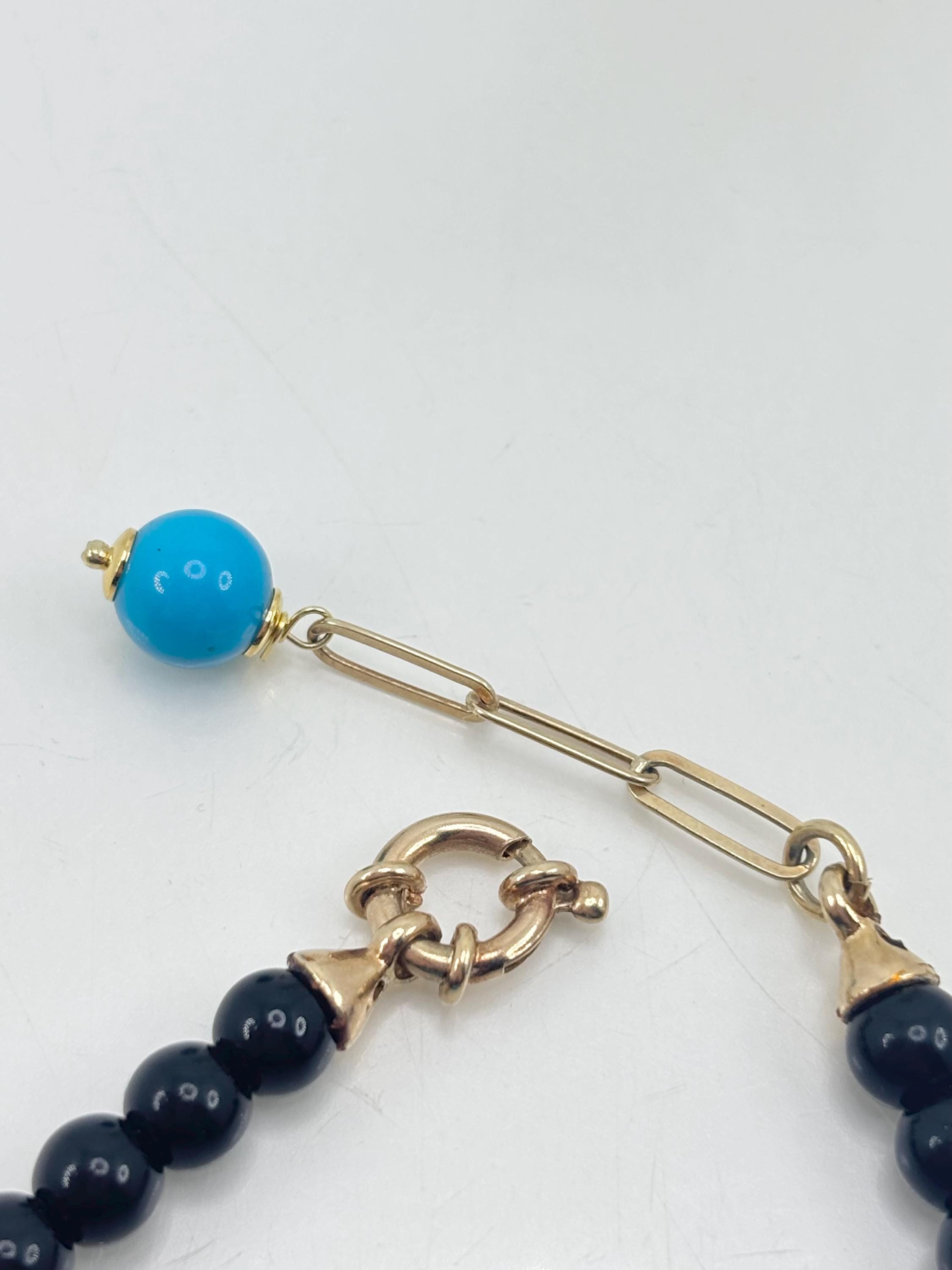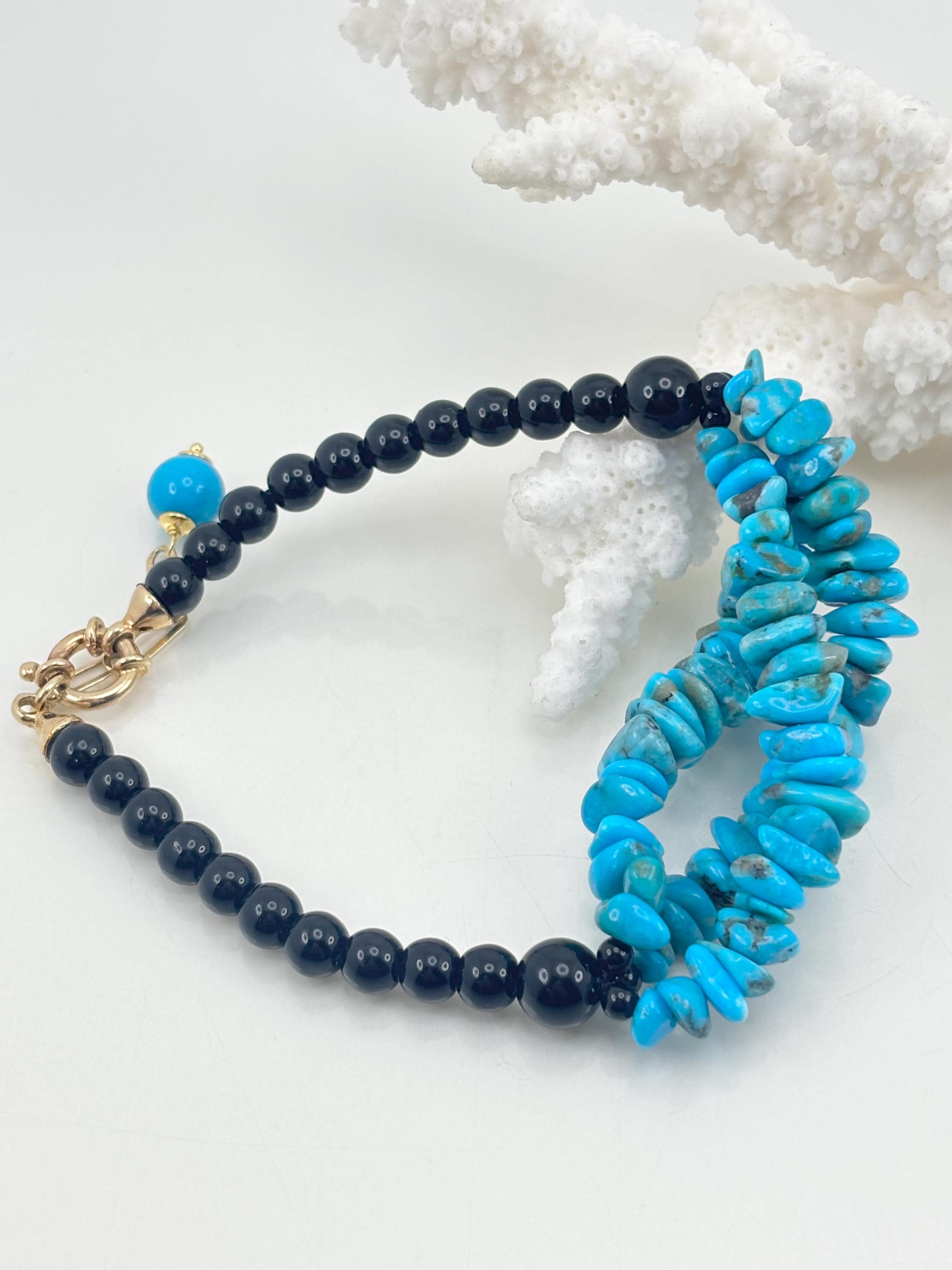 Splendido bracciale con scaglie di turchese stabilizzato naturale proveniente dalle miniere dell’Arizona (Stati Uniti) e sfere in onice nero naturale con chiusura in argento 925 placcato oro. Lavorato e realizzato da artigiani di Torre del Greco.
